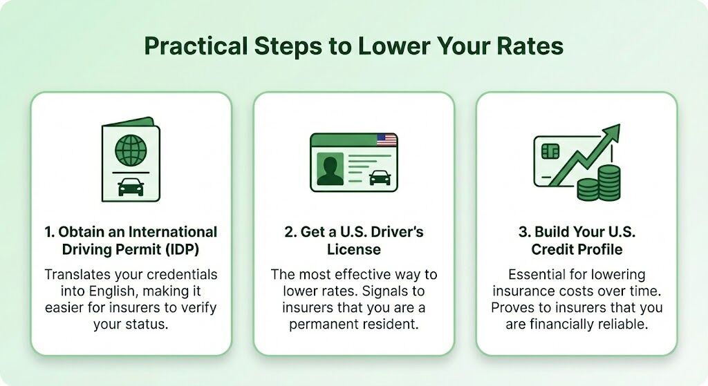 This is the single most effective way to lower your rates. Even if you are legally allowed to drive on your foreign license for a year, obtaining a state-issued license immediately signals to insurers that you are a permanent resident subject to local driving laws.